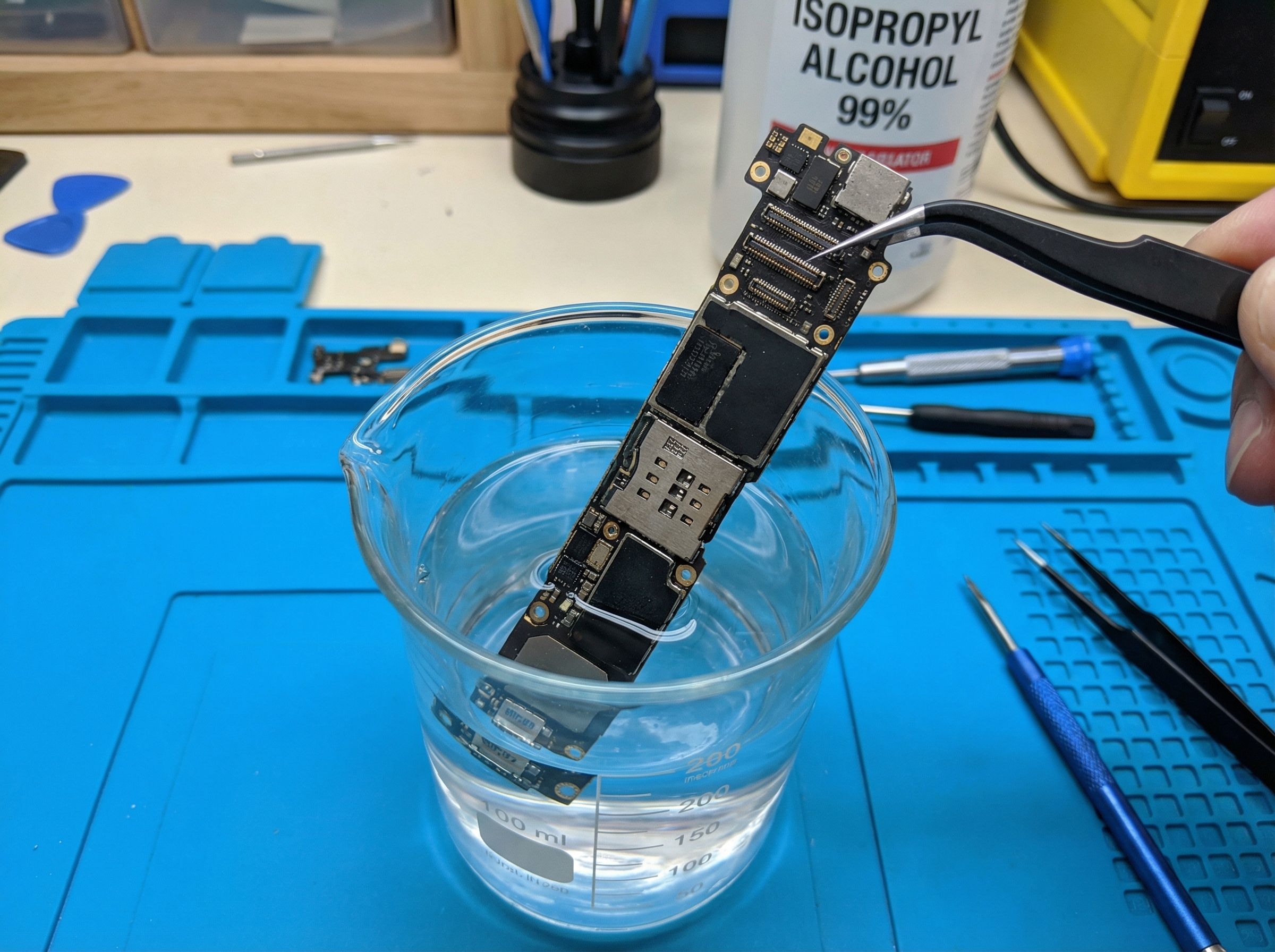 Погружение платы в изопропиловый спирт в целом допустимо и широко применяется в ремонте, но только если понимать, что вы делаете и зачем. IPA чаще используют не как «ванну, которая лечит всё», а как инструмент для вытеснения воды, растворения загрязнений и переноса их из труднодоступных зон наружу. При этом спирт — не волшебный нейтрализатор: соли и сахара из напитков он растворяет хуже, а часть грязи может просто размазать.